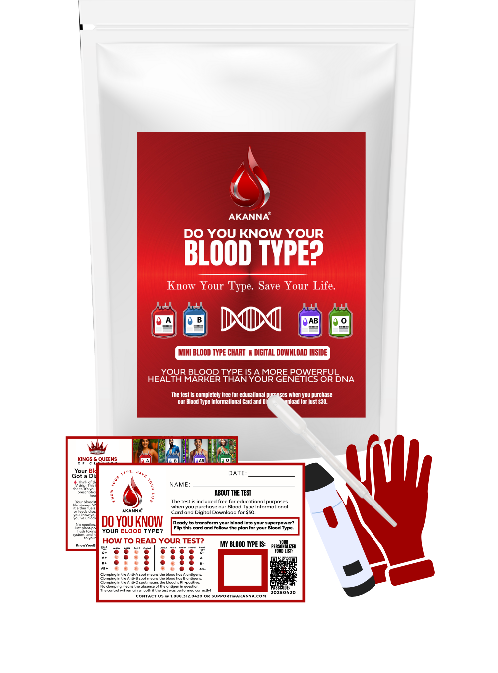 iscover your blood type in minutes with our quick and easy test kit — included free with your purchase of the Blood Type Informational Card & Digital Food Guide for just $30. This includes safety lancet, pipette, gloves, & our expert guidance.